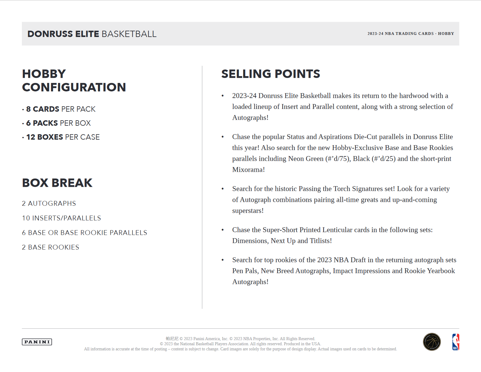 - 2023-24 Donruss Elite Basketball makes its return to the hardwood with a loaded lineup of Insert and Parallel content, along with a strong selection of Autographs!