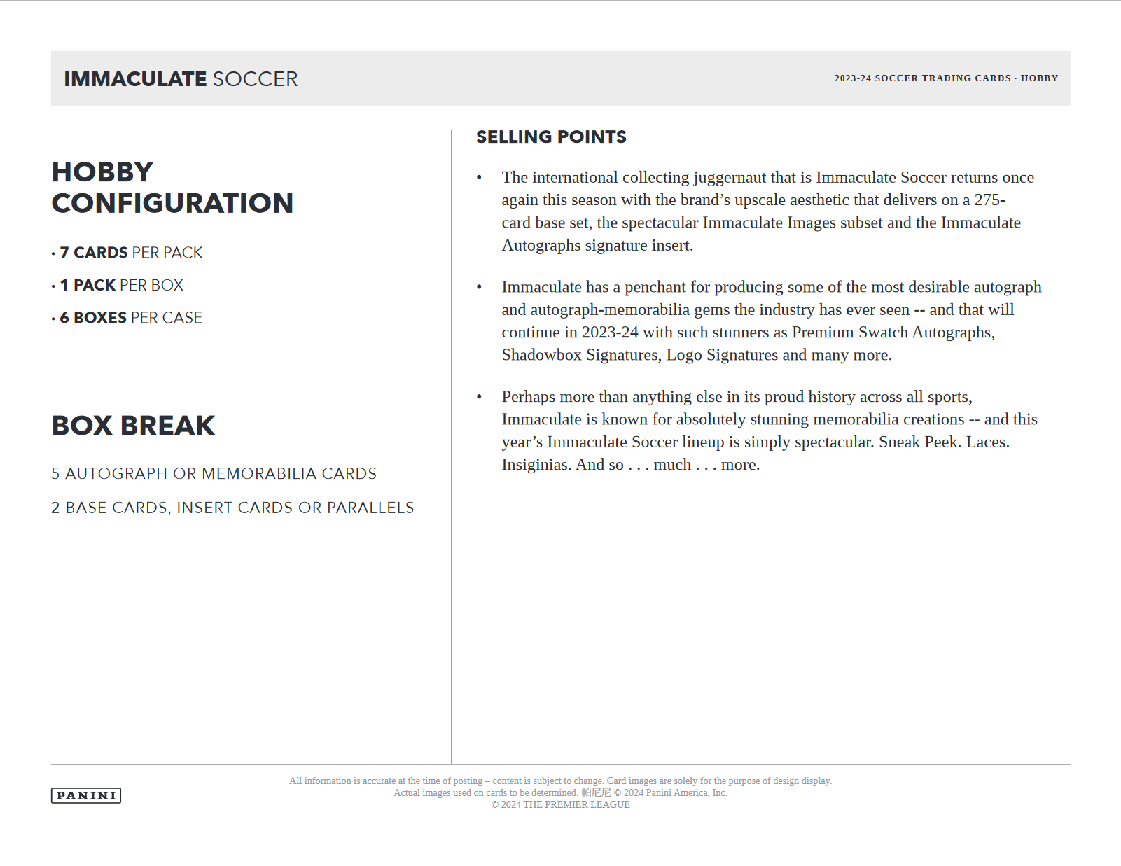 - The international collecting juggernaut that is Immaculate Soccer returns once again this season with the brand’s upscale aesthetic that delivers on a 275-card base set, the spectacular Immaculate Images subset and the Immaculate Autographs signature insert.